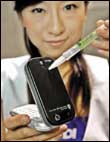 موظفة بشركة الاتصالات اليابانية KDDI تقوم بعرض نموذج أولي لهاتف محمول يعمل بواسطة خلايا وقود الميثانول، وقامت شركة هيتاشي العالمية بإنتاج هذا المحمول، وفي الصورة تقوم العارضة بتعبئة الهاتف المحمول بواسطة جهاز التعبئة المشابه في شكله للقلم العادي، حيث يحتوي على مخزون من خلايا وقود الميثانول التي يتم سكبها داخل بطارية الجهاز لتعبئته.