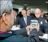 Dulles Int Apt/Washington, US South Korean get scanned with a new 10-fingerprint scanner (foreground) for international arriving passengers at Dulles International Airport in Dullas,Virginia. Most foreigners aged who travel to the United States have been required since 2004 to provide the prints of two fingers and a digital photograph to US officials,