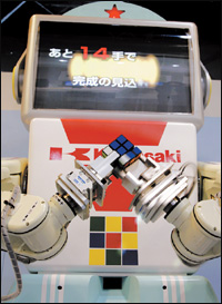 Tokyo, JAPAN Japans machinery maker Kawasaki Heavy Industries robot زCube-kun solve a 3x3x3 Rubikصs Cube for the demonstration in Tokyo 04 December 2007. The double armed industrial robot is displayed with advanced technology products here through the end of February.