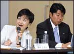 الرئيس التنفيذي لشركة سانيو الإلكترونية تومويو نوناكا (يسار)، والمدير العام للشركة توشيماسا لو (يسار) أثناء إجابتهم على أسئلة الصحفيين في المؤتمر الصحفي الذي أقامته الشركة أوائل هذا الشهر بمناسبة إعلانها تخفيض العمالة في الشركة واستغناءها عن 14 ألف وظيفة في جميع أنحاء العالم ومحاولة العودة لجني الأرباح من خلال التكنولوجيات الصديقة.