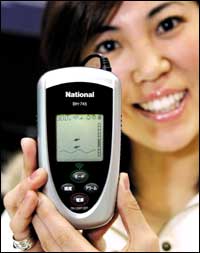موظفة بشركة ماتسوشيتا العملاقة للصناعات الإلكترونية تستعرض منتج شركتها الجديد من أجهزة الكشف عن تجمعات الأسماك.