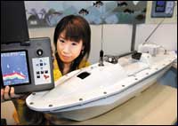 موظفة بشركة كودين Coden اليابانية تستعرض منتج شركتها الجديد من الأجهزة المكتشفة عن التجمعات السمكية، وهذا المنتج الجديد من الشركة والذي أطلق عليه اسم Kamome يتمكن من ........