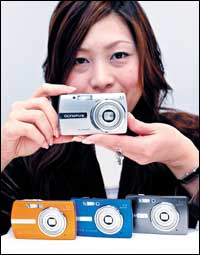 موظفة يابانية بشركة اولمبوس اليابانية، التي تعد واحدة من الشركات الرائدة في صناعة الكاميرات الرقمية، تستعرض منتج الشركة الجديد من الكاميرات الرقمية.