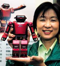 إحدى مديرات شركة JVC جاي في سي اليابانية العملاقة والرائدة في مجال صناعة الإلكترونيات وأجهزة الفيديو الرقمية تستعرض منتج جديد للشركة عبارة عن رجل آلي لا يتجاوز طوله 20 سم، ........