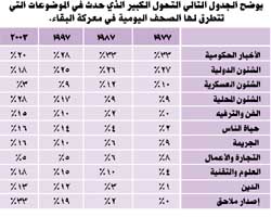 يوضح الجدول التالي التحول الكبير الذي حدث في الموضوعات التي تتطرق لها الصحف اليومية في معركة البقاء.