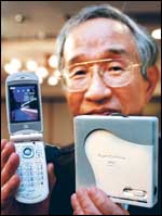 رئيس شركة توشيبا اليابانية للالكترونيات تاداشي أوكامورا يعرض نموذجا تجريبيا لبطاريات خلايا الوقود ( يمين) والتي توفر استخدام الطاقة لأجهزة الهواتف النقالة لمدة أكبر ويتوقع ........