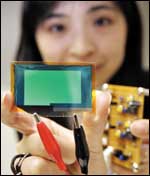 موظفة من شركة بايونير اليابانية تعرض الشاشة الجديدة التي تعمل بنظام الإضاءة العضوية والتي تتمتع بقاعدة قابلة للطي، وذلك في أحد معامل الشركة في اليابان.