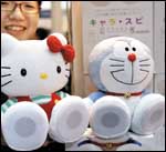 موظفة بشركة(KDSystem) تعرض المنتج الجديد من دمى الأطفال المزوَّدة بمكبرات صوتية خاصة من نوع بايونير والتي صممت بشكل ممتاز على أشكال القدمين للدميتين اللتين تجسدان اثنين من ........