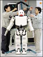 مجموعة من المهندسين بشركة تمسوك لصناعة الروبورتات يتفحصون الروبوت الجديد شينبو(Shinpo) بعد انتهائه من الفقرة الاستعراضية الخاصة به بالمتحف العلمي بمدينة نيغاتا الواقعة على ........