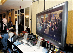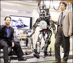 سيكا، اليابان: روبوت بشري يحرك ساقيه في عرض بإحدى مختبرات المعهد الدولي لأبحاث الاتصالات في مدينة سيكا اليابانية، بينما يجري التحكم فيه عن طريق إشارات قادمة من دماغ قرد من معمل في الولايات المتحدة عبر الإنترنت، حيث أجرى فريق من العلماء اليابانيين والأمريكيين اختبارا ناجحا في هذه الطريقة من التحكم.