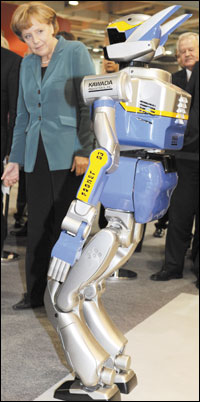 هانوفر، ألمانيا: مستشارة ألمانيا أنجيلا ميركل تلاقي الروبوت بروميت أثناء زيارتها معرض هانوفر للتقنية بوسط ألمانيا، الذي يشارك فيه أكثر من 5100 شركة تقنية من ستين دولة.