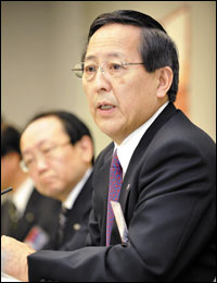 طوكيو، اليابان: كونيهيكو ساتو من شركة فيكتور اليابانية يعلن في مؤتمر صحفي في سوق طوكيو للأسهم عزم الشركة على إيقاف كل منتجات الشركة المحلية من التلفزيونات المسطحة وإغلاق مصنع للشركة في بريطانيا وسط تنافس حاد بين الشركات.