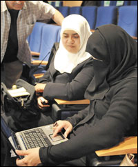 سخيرات، المغرب: مغربيات يعملن على حاسوب محمول بعد الانطلاق الرسمي لمشروع شبكة مايكروسوف المغرب بالاشتراك بين مايكروسوفت وشركة أوراسكوم المصرية للاتصالات في أثناء انعقاد فعاليات المنتدى العربي للمعلمين في مدينة سخيرات بالقرب من الرباط.