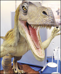 طوكيو، اليابان:ديناصور روبوت يفتح فمه لإخافة الزوار في معرض قوة السوائل في طوكيو. وهو من إنتاج كوكورو اليابانية للروبوت، ويستطيع التعرف على الزوار الذين يمرون بالقرب منه عن طريق مجس يعمل بالأشعة تحت الحمراء.
