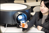 Tokyo, Japan Employee for Japanese electronics giant Sony displays the companyصs new high-definition projector زVPL-FH300Lس and the newly developed LCD device زBrightEraس with a resolution of 2,048 x 1,080 pixels. The new projector, equipped with dual 275W lamps which can project bright images of 6,000 lumens, was developed for commercial use at large
