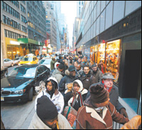 New York, United States Customers line up outside the Nintendo World Store in Rockefeller Center in New York City. Despite an increase in production Nintendo has been unable to keep up with the customer demand for the Wii gaming system which debuted last year. Due to shortages and difficulty obtaining the game, many customers started queuing up around