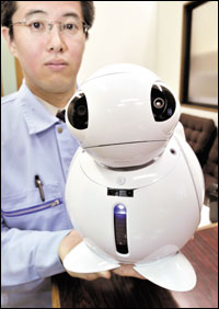كاواساكي، اليابان:باحث في توشيبا اليابانية يعرض نموذجا لروبوت مكتبي جديد أطلقت عليه اسم (أبريبوكو) يمكنه التعرف على الأصوات وتشغيل الأجهزة الإلكترونية مثل التلفزيونات والمكيفات. وتدعي الشركة أن هذا الروبوت بإمكانه تعلم اللغات البشرية.