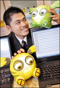 جنيف، سويسرا: المخترع التايواني ريان ليو يعرض لعبة ذات قدرة على تغيير ملامح وجهه حسب الرسائل التي يتلقاها من الحاسوب. وقد عرض هذا الاختراع في المعرض العالمي للاختراع في جنيف، الذي شهد أكثر من 700 عرض من أكثر 45 دولة.