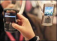 برشلونة، إسبانيا: أحد زوار معرض برشلونة للاتصالات يتفحص جهاز موبايل متطور يشتمل على خدمات الاتصال اللاسلكي والبريد الإلكتروني وتصفح الإنترنت وغيرها من الخدمات المهمة بالنسبة لرجال الأعمال.