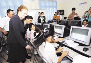هانوي - فيتنام :هنريتا فور (يسار) المسئولة في وكالة التنمية والمساعدات الأمريكية تقوم بزيارة أحد الفصول الدراسية في مجال تقنية المعلومات التي تمولها الوكالة في مدينة هانوي بفيتنام في إطار برنامج تدريبي للمعاقين.