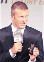 سيول، كوريا الجنوبية: نجم إنجلترا لكرة القدم ديفيد بيكهام يعرض جهاز جوال جديداً من إنتاج موتورولا أثناء عروض إلكترونية في سيول بكوريا الجنوبية.