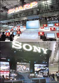 طوكيو، اليابان: صورة مركبة توضح أجهزة تلفزيونات رقمية كبيرة لشركة شارب (أعلى) وسوني (أسفل) لدى عرضها ضمن معرض سيتك للإلكترونيات في شيبا باليابان، حيث وقّعت الشركات على اتفاق للتعاون في مجال تطوير أجهزة التلفزيون الرقمية.