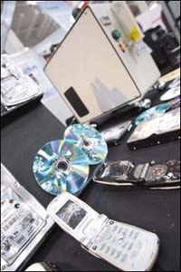 هانوفر، ألمانيا: أجهزة جوال ومعدات إلكترونية محطمة بجوار صندوق تكسير أوتوماتيكي يمثّل جيلاً جديداً من تقنية تكسير الأجهزة الإلكترونية يعمل عن طريق الأشعة الرقمية لتكسير الأجهزة الإلكترونية بسرعة وهدوء بغرض منع سرقة المعلومات.