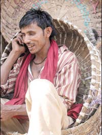 مومباي، الهند: عامل أجرة هندي جلس يتحدث عبر الهاتف الجوال بعد أن تعب من انتظار زبائنه في أحد الأسواق المحلية بمدينة مومباي.
