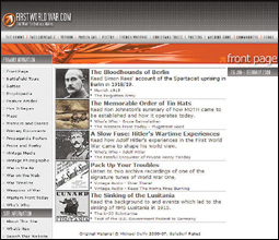 * إعداد - محمد الزواوي- يحتوي هذا الموقع على تأريخ شامل للحرب العالمية الأولى، والتي شهدت صراعات مريرة بين الدول الأوروبية، والتي مهدت بعد ذلك إلى صعود النازي في ألمانيا ومن ثم الحرب العالمية الثانية التي أكلت الأخضر واليابس في القارة الأوروبية العجوز. ويقدم هذا الموقع معلومات مفصلة عن أسباب اندلاع شرارة تلك الحرب والأطراف المشاركة فيها، إضافة إلى