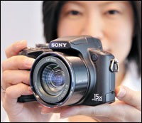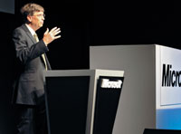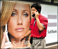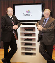 لندن، المملكة المتحدة: المدير العام لـ(بي بي سي) مارك طومسون (يسار) والرئيس التنفيذي لـ (آي تي في) مايكل جريد ينظران إلى المصورين أثناء غداء للاتفاق على خدمة التلفاز الفضائي الرقمي (فريسات) في (سمرست هاوس) بلندن. وخدمة التلفاز الفضائي الرقمي سوف تسمح للمشاهدين عبر بريطانيا الحصول على إشارة رقمية مجانية وعالية الوضوح بدون أية اشتراكات أوعقود، وخدمة