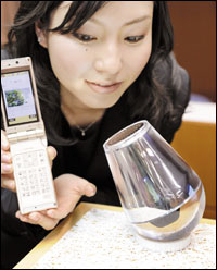 طوكيو، اليابان: موظفة بشركة (ان تي تي) للاتصالات تعرض نموذجاً لجهاز بث الروائح (يمين)، الذي يمكن مستخدمه من تحميل الروائح من مخزون للروائح في خادم تابع للشركة إلى أي جوال، ومن ثم إرسالها عن طريق الأشعة تحت الحمراء إلى جهاز بث آخر في أي مكان.