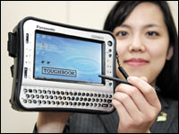 طوكيو، اليابان: جهاز حاسوب دفتري يتحمل الخدمة الشاقة من شركة ماتسوشيتا اليابانية، مزود بمعالج إنتل وشاشة لمس مسطحة (أل سي دي) بحجم 5.6 بوصة داخل إطار مقاوم للماء.