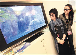 كان، فرنسا: فتاتان تنظران إلى جهاز تلفاز بمعرض كان للإلكترونيات بجنوب فرنسا، الذي يعد أكبر سوق على مستوى العالم للمعدات الرقمية مثل الأجهزة السمعية والبصرية والجوالات وألعاب الفيديو والتلفزيونات والإنترنت وأجهزة العرض.
