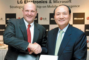 أعلنت كل من شركة إل جي إلكترونيكس، وشركة مايكروسوفت كوربوريشن، عن توقيع مذكرة تفاهم لتشكيل تعاون استراتيجي في مجال التكامل بين الهواتف المتحركة.وقع الاتفاقية يونغ نام، نائب الرئيس، الرئيس التنفيذي لشركة إل جي إلكترونيكس، وستيف بالمر، الرئيس التنفيذي لشركة مايكروسوفت، في العاصمة الكورية سول.وصرح نام خلال مراسم التوقيع قائلاً: (ستؤدي هذا الاتفاقية بين