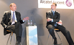 المدير التنفيذي لشركة (ألكاتيل - لوسنت) الفرنسية بن فيرواين (يسار) والمدير المالي للشركة هوبرت دو بسكويدو يتحدثان في مؤتمر صحفي عن الأرباح الربع سنوية للشركة.