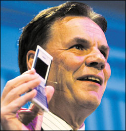 برشلونة، إسبانيا: رئيس نوكيا (أولي بيكا كالاسفو) يعرض آخر إنتاج الشركة من أجهزة الهاتف الجوال في مؤتمر صحفي أقيم ضمن أنشطة المعرض العالمي للهاتف الجوال ببرشلونة.