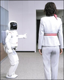 طوكيو، اليابان: صورة للروبوت (أسيمو)، وهو يوجه سيدة للدخول. صنعت شركة هوندا اليابانية للسيارات هذا الروبوت الذي يستطيع القيام بأنشطة متعددة، حيث يمكن لمجموعة من هذا الروبوت تقديم خدمة متكاملة بتوزيع أنشطة الخدمة بين أعضاء المجموعة.