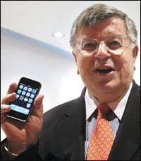 باريس، فرنسا: تظهر هذه الصورة التي التقطت في 28 نوفمبر 2007 رئيس شركة (فرانس تيليكوم) الفرنسية ديديه لومبارد مع هاتف من نوع iphone في محل بباريس بجادة شامب إليزيه. وقد أعلنت شركة (أورانج) للهواتف الجوالة التابعة لشركة فرانس تيليكوم في السادس عشر من مايو 2008 أنها سوف توزع هواتف iphone من شركة آبل في النمسا وبلجيكا ومصر والأردن وبولندا والبرتغال وجمهورية