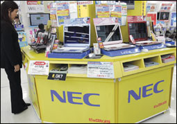 طوكيو، اليابان: امرأة تنظر إلى حاسبها المحمول من شركة NEC أكبر شركة مصنعة لمعدات شبكات الاتصالات باليابان، وذلك في أحد محال الإلكترونيات في طوكيو. وقد ضاعفت شركة NEC من أرباحها ربع السنوية، وذلك بعد أن خفضت نفقاتها وقامت بعملية توكيل الأعمال إلى الخارج، ولكن تطلعها إلى تحقيق أرباح بنسبة 54% لم تتحقق.