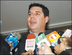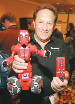 لاس فيجاس - الولايات المتحدة: نائب رئيس مبيعات مجموعة واوي آرت دانيس يعرض لعبة ثلاثية الأرجل من منتجات الشركة في مؤتمر صحفي ضمن أنشطة معرض لاس فيجاس للإلكترونيات في الولايات المتحدة. واللعبة عبارة عن روبوت يمكن تحريكه في خطوط معينة عن طريق مجسات ضوئية، كما يمكنه الرقص وتفادي الأجسام والتقاط الكرات عند إصدار أوامر صوتية.