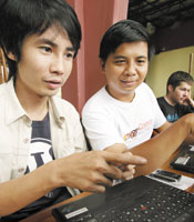 بنوم بنه - كمبوديا: المدون الكمبودي هور فيراك (يسار) يعمل على جهاز حاسوبه اللاب توب في أحد مقاهي بنوم بنه بكمبوديا. ويقول فيراك إنه عندما أنشأ مدونته قبل ثلاثة أعوام لم يكن في كمبوديا سوى حفنة قليلة من المدونين، وكان يقوم بجولة على دراجته النارية لالتقاط بعض الصور وإرسالها على مدونته (بلوج).