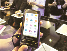 سنغافورة - سنغافورة: جهاز جوال ذكي من سامسونج أثناء عرضه في معرض (كومينيك آسيا) للتقنية في سنغافورة. وقد كشفت سامسونج عن أحدث أجهزتها الجوالة في المعرض ويدعى (أومني) ومزود بشاشة تعمل باللمس. وسيتم إطلاق هذا الجهاز المزود بكاميرا 5 ميجا بيكسل في جنوب شرق آسيا الأسبوع القادم.