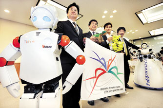طوكيو - اليابان: رؤساء شركات الروبوتات اليابانية يعرضون مبتكراتهم أمام المصورين خلال مؤتمر صحفي مشترك في العاصمة اليابانية طوكيو. وقد أعلنت الشركات الأربع عن تأسيس اتحاد لتسويق روبوتات الجيل الحديثة المنزلية.