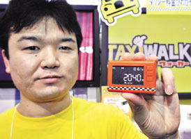 طوكيو - اليابان: موظف بشركة بانداي اليابانية للألعاب يعرض ابتكاراً جديداً على شكل عداد سيارة الأجرة يقوم بإظهار أجرة التاكسي للمسافات التي يمكن للشخص أن يقطعها مشيًا على الأقدام وذلك بمعرض طوكيو للألعاب. وعلى سبيل المثال فإن المشي لمسافة كيلومترين تكلف الراكب في طوكيو ما يقرب من 7 دولارات أمريكية. ويهدف الابتكار تعريف هواة المشي ما يمكنهم توفيره من