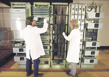 لندن - المملكة المتحدة: فنيون يقومون بتنظيف جهاز كمبيوتر قديم في متحف العلوم بالعاصمة البريطانية. وقد تم استخدام هذا الكمبيوتر خلال الفترة من 1957 - 1972م في إجراء السحب على الأرقام الفائزة في مسابقة (بريميم بوند). وسيتم عرض هذا الجهاز في متحف العلوم للجمهور ابتداء من 26 يونيو الحالي.