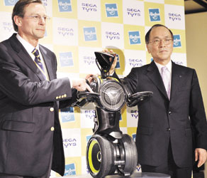 طوكيو - اليابان: رئيس شركة سيجا اليابانية للألعاب أساوا كوكبيرن (يمين)، والمدير التنفيذي في شركة هاسبرو الأمريكية للتطوير يقدمان في العاصمة اليابانية روبوتا موسيقيا أطلق عليه اسم(A.M.P) بإمكانه التحرك على عجلتين وعزف موسيقى رقمية من خلال النظام الموسيقى المدمج داخله.