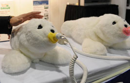 رجل يطعم روبوتا على شكل حيوان الفقمة القطبية بجناح المنظمة اليابانية للتجارة الخارجية بمعرض لاس فيجاس للإلكترونيات. وبإمكان هذا الروبوت الاستجابة للضوء والصوت ودرجة الحرارة واللمس والحركة، وبمرور الوقت يتطور إلى ما يشبه الحيوان الأليف، الذي يوفر الصحبة للأشخاص الذين لا يستطيعون استصحاب الحيوانات الأليفة الحقيقية، مثل المرضى وكبار السن.