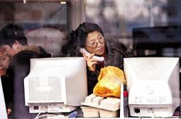 سيدة صينية تتحدث عبر الهاتف في أحد محلات الصيانة لأجهزة الكمبيوتر في العاصمة الصينية بكين. وكانت الصين قد انقطعت عن شبكة الإنترنت العالمية عقب الزلزال الشديد الذي ضرب سواحل تايلاند واثر على الكابلات البحرية التي تعد المغذي الرئيسي لمناطق شرق آسيا. وأدى هذا إلى قطع الخدمة عن ملايين المستخدمين الذين استشاطوا غضباً في الثلاثة أيام وهي مدة الانقطاع.