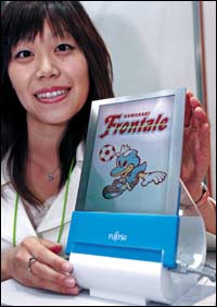 توموكو فيوكيو موظفة تابعة لشركة فوجيتسو اليابانية(Fujitsu) تستعرض منتج الشركة الجديد من شاشات الورق الإلكترونية الملونة.