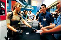 مجموعة من زوار معرض ألعاب الفيديو الرقمية من الجيل الثالث يتزاحمون لأخذ توقيع تذكاري من العارضة البريطانية كاريما اديبايب التي تجسد شخصية لارا ........